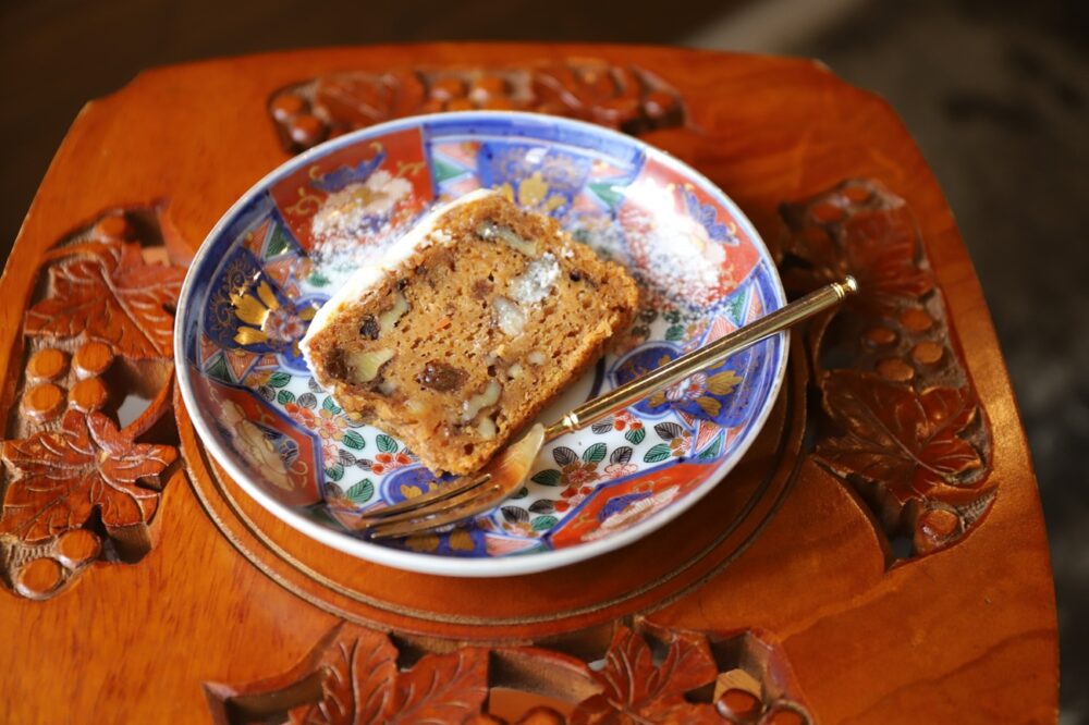 人気の「キャロットケーキ」は、材料の7割が人参というヘルシーな一品。小麦粉はつなぎ程度に抑え、素材そのものの味を大切にしています。にんじんの持つ本来のやさしい甘味をベースに、くるみとレーズンの食感がほどよいアクセントに。仕上げには、クリームチーズに粉糖、レモン汁、バターを合わせたさわやかな風味のフロスティングがトッピングされています。
