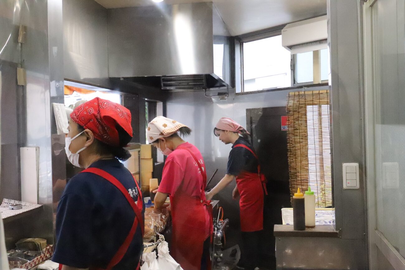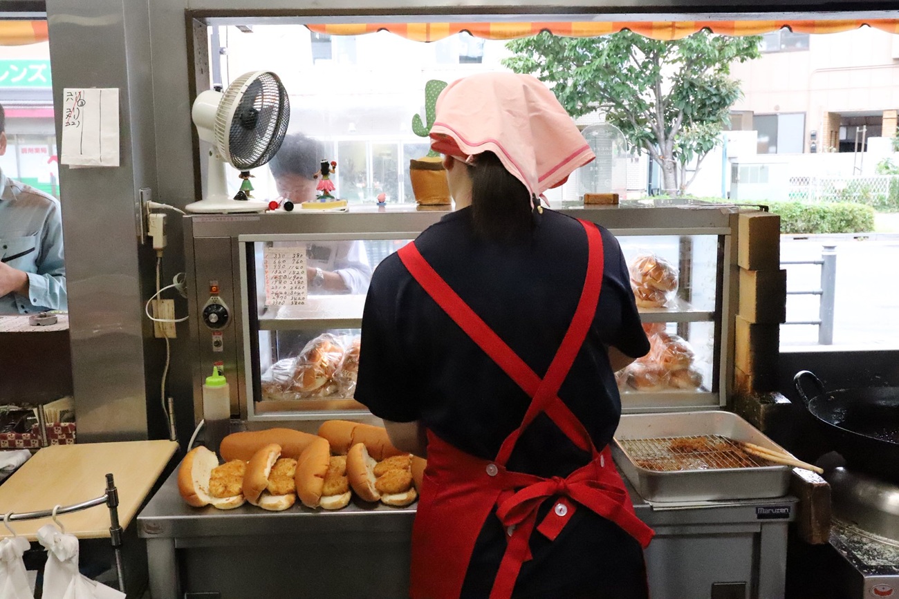 やがて娘さんと従業員さんが出勤し、4人体制での営業に。1人が揚げ物を担当し、1人がパンに挟んでいくという無駄のない連携プレイが繰り広げられます。