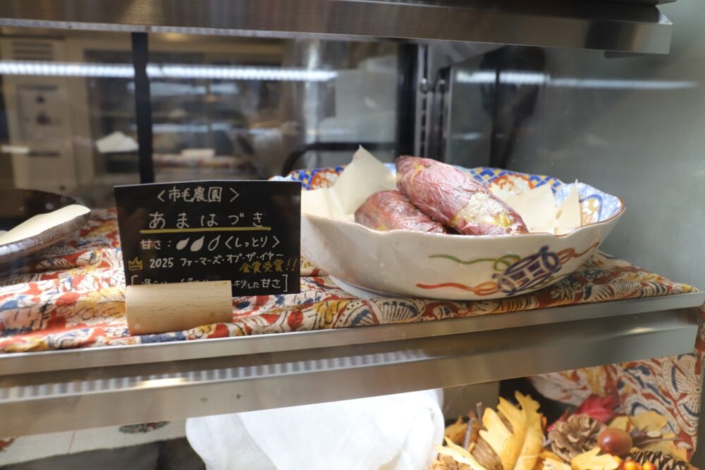 この日の店頭には、茨城県鉾田市市毛農園から取り寄せた選りすぐりのさつまいもが。評価会にて受賞経歴のあるシルクスイートに紅はるか、ホクホク感が特徴のあまはづきが並んでいます。
