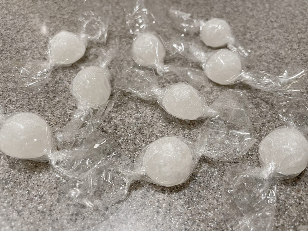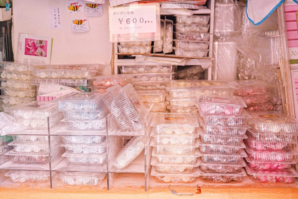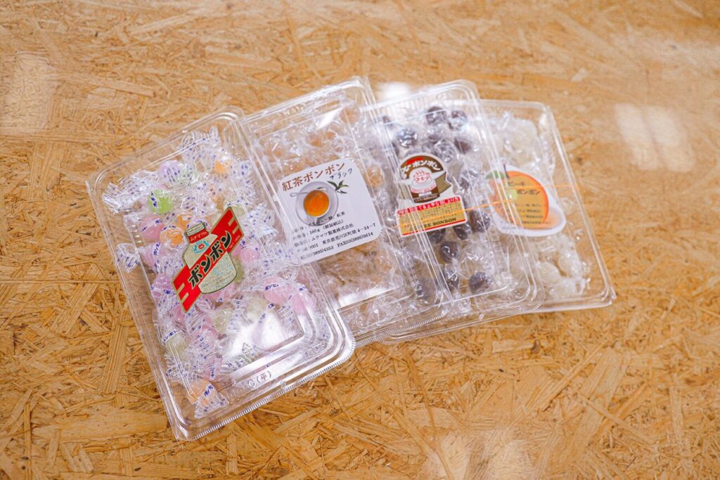 ムラマツ製菓で販売しているのはお砂糖で甘―いシロップを包みこんだ昔懐かしいお菓子「ボンボン」。砂糖の中にリキュールやシロップなどを閉じ込めたキャンディーのことで、フランス語の「良い」という言葉が由来となっています。チョコレートでウイスキーを包んだ“チョコレートボンボン”とはまったく異なるもの。直売所のような店内には、バラエティ豊かなラインナップのボンボンが並びます。