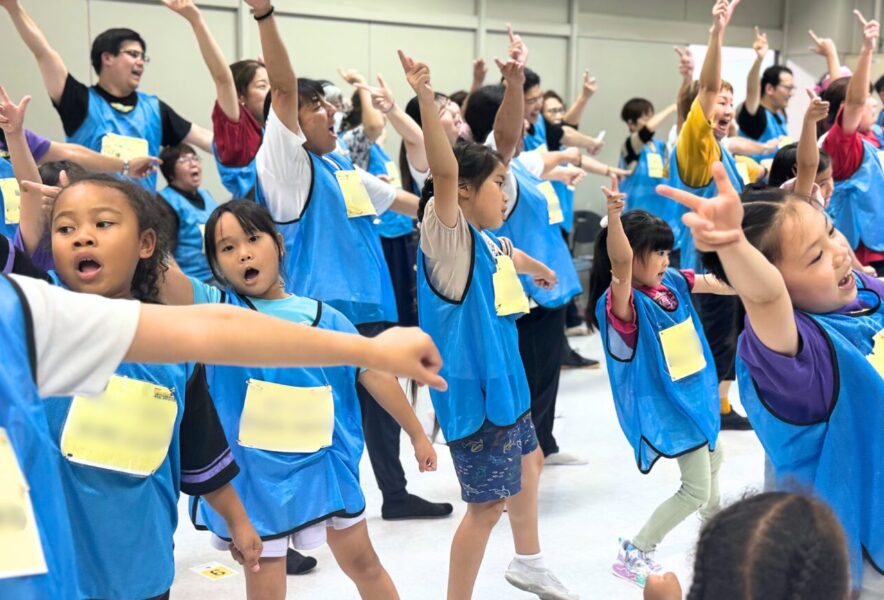 4歳から87歳までの幅広い年代の60名ほどの出演者さんが、ピアノに合わせ、荒川をテーマにした歌と踊りで楽しそうに稽古をしていました。