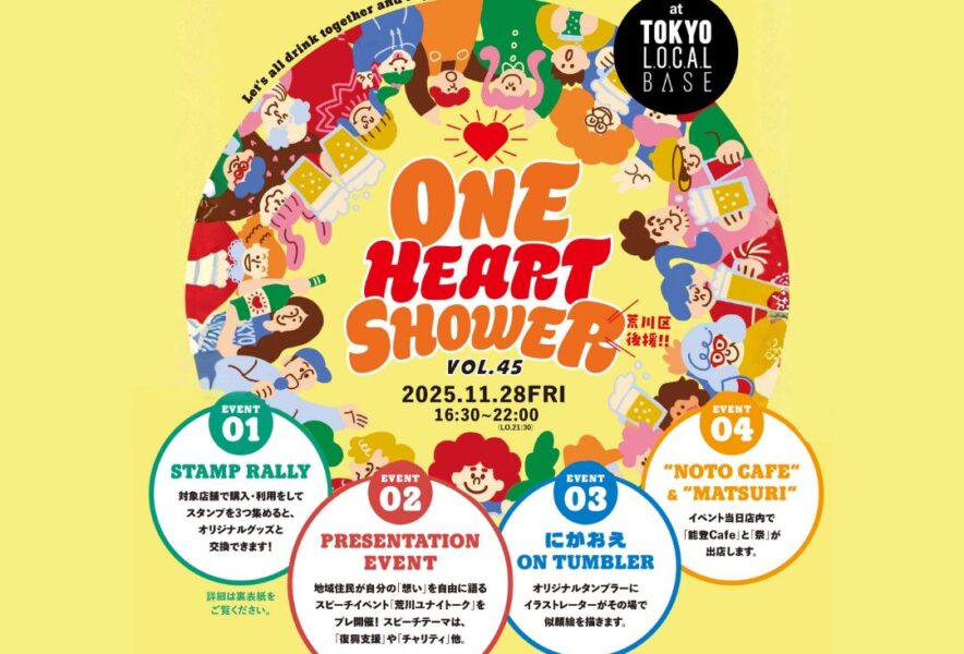 東京都荒川区を拠点に地域活性と復興支援を行うNPO法人TOKYO L.O.C.A.L と株式会社ROOM810は、 27 店舗の地域事業者と連携し、地域の賑わいづくりから継続的な復興支援を生み出す“地域活性型チャリティイベント”「ONE HEART SHOWER vol.45」を 11 月 28 日(金)に開催します。
