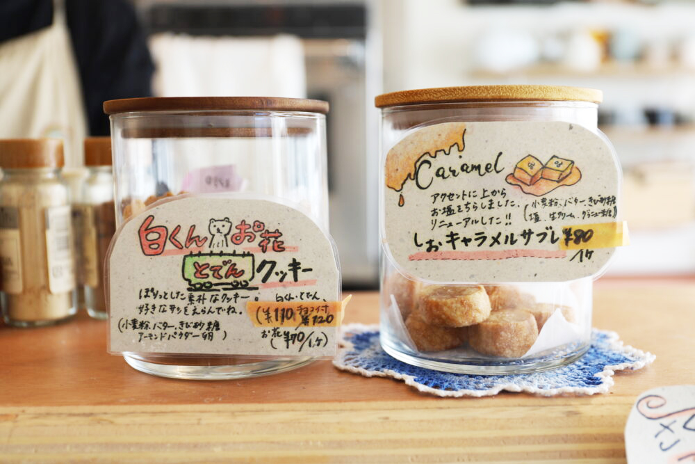高校時代は食物科で学んでいたという白桃さん。おやつ作りは小学生の頃から趣味で続けていたそうで「趣味で作れる、お家でも作れる範囲のものを作っています。」と。どのおやつも趣味の範囲を超える美味しさ。取材時にはプレーンスコーン、チョコレートケーキ、白くんクッキー、季節のジャムとクリームを注文し、どのおやつも趣味の範囲を超える美味しさ。ちなみに白くんクッキーはお店のキャラクター「白くん」を形どったもの。