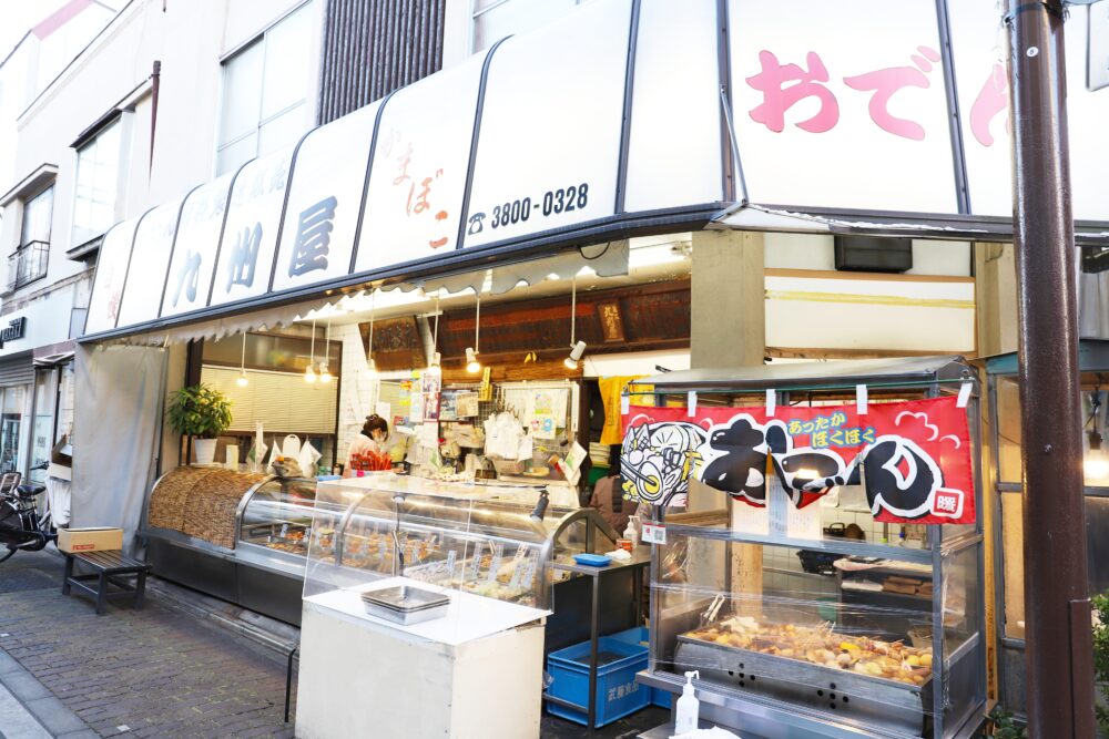 常連客がお店の方と冗談を交わしながら買い物する店先。道行く人がそのやり取りにつられ、思わず足を止め、おでん種を選ぶ姿が。