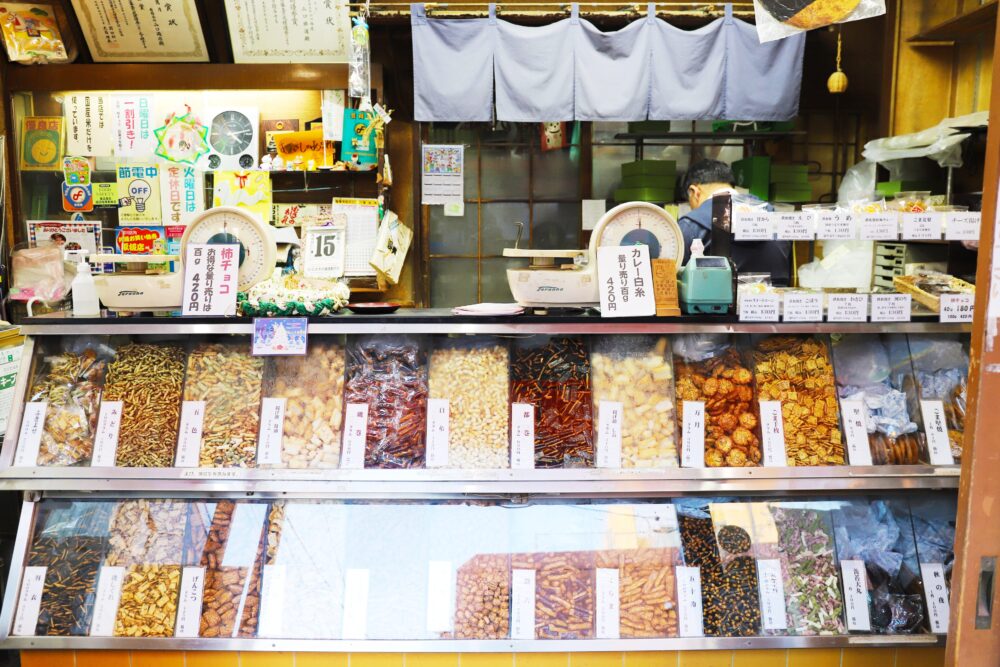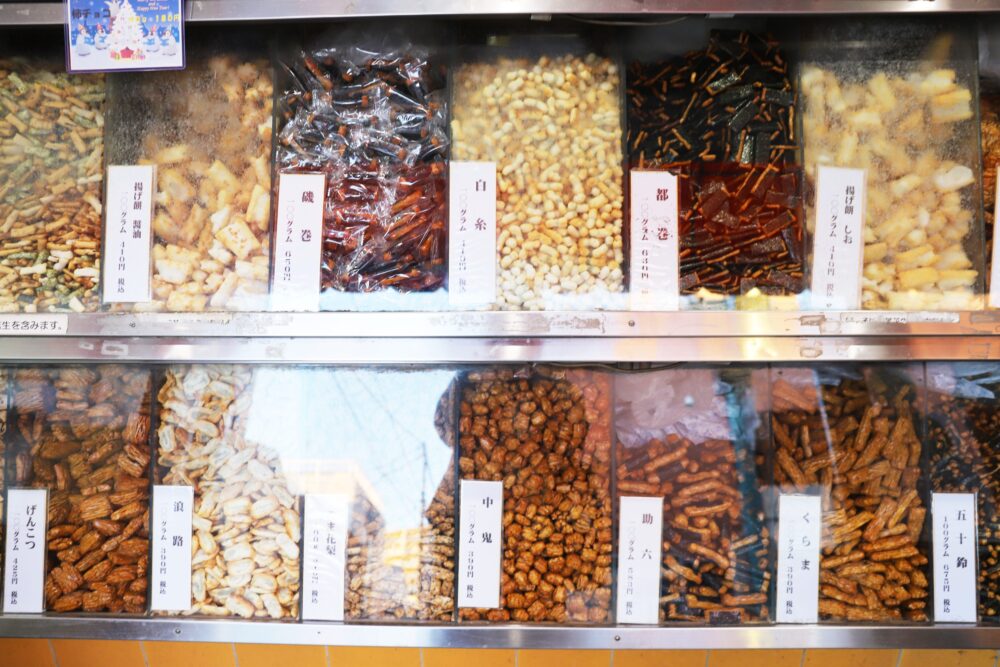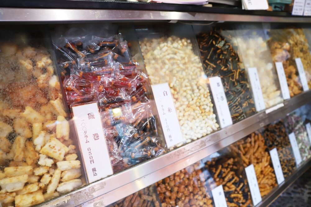 ショーケースに入っているあられは量り売りで販売され、好みの種類を少しずつ選べるのも楽しみのひとつ。用途や予算に合わせてオリジナルで詰め合わせができるため、年末の手土産選びにも重宝されています。