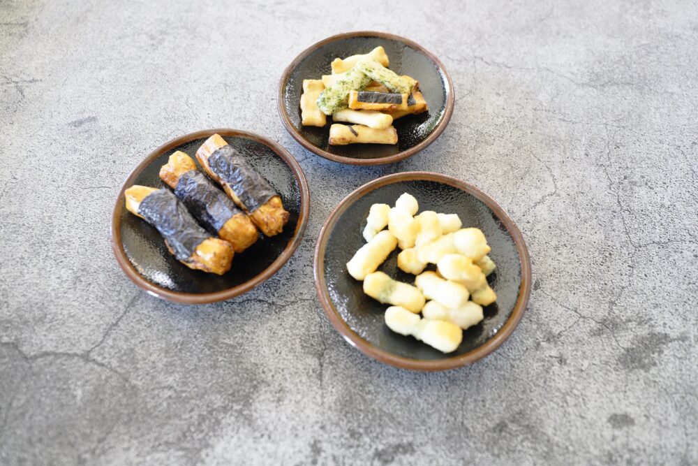 店先には、約30種類ほどのさつま揚げやおでん種がずらり。はんぺん、やつみれ、関東では珍しい牛すじなどもあって、練り物は全て自家製。