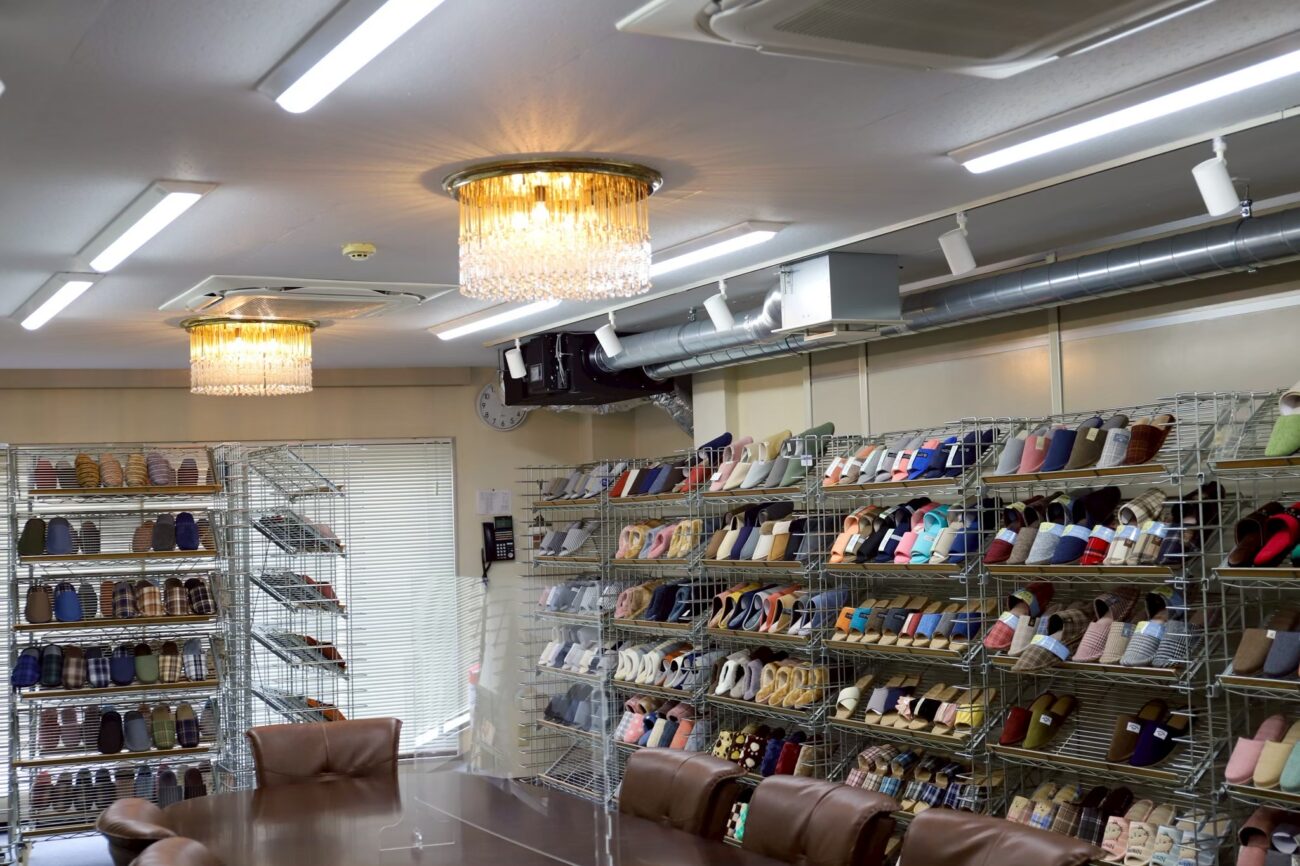 応接室にズラリとならぶスリッパ。 豪華なシャンデリアが会社の歴史を 感じさせてくれます。